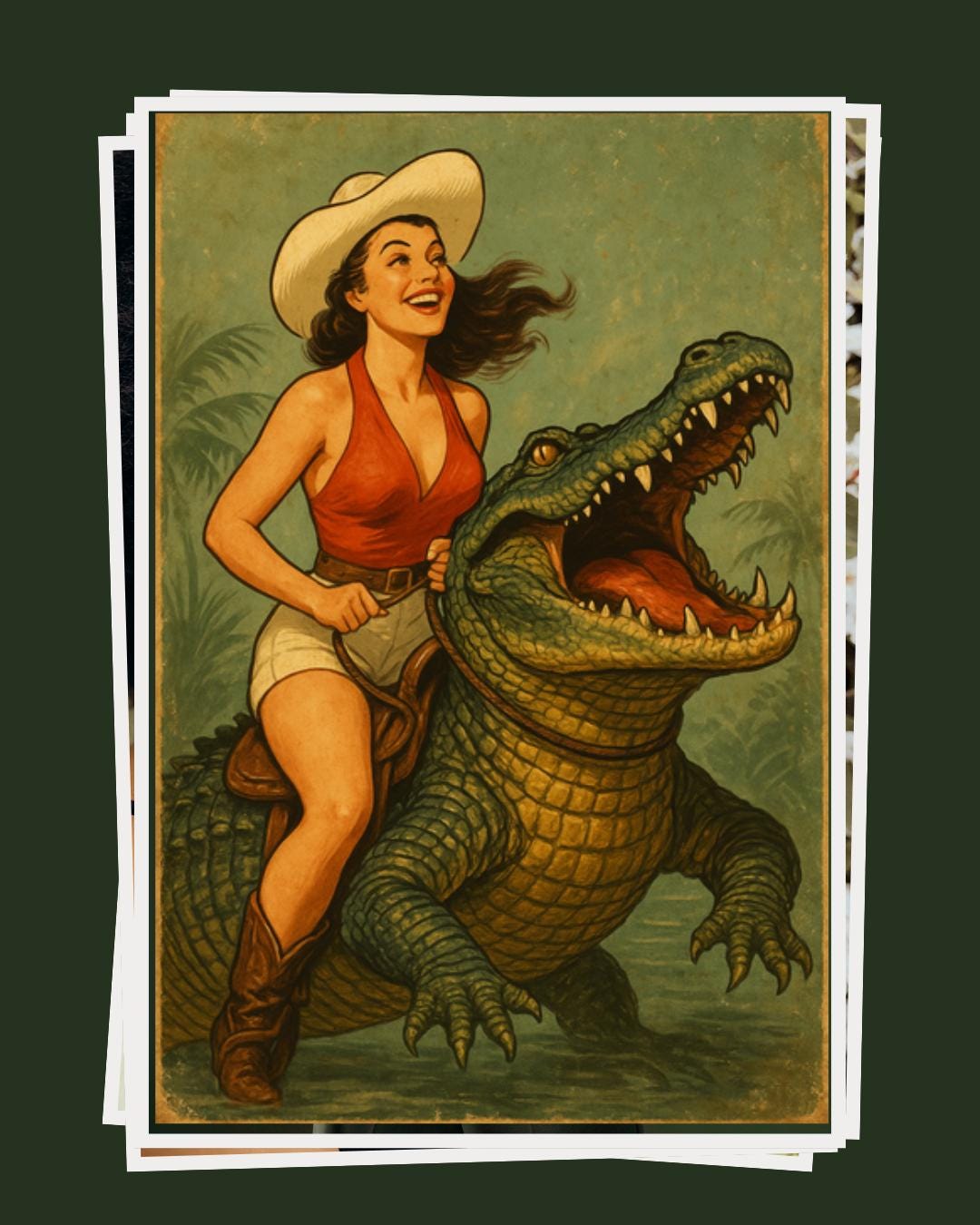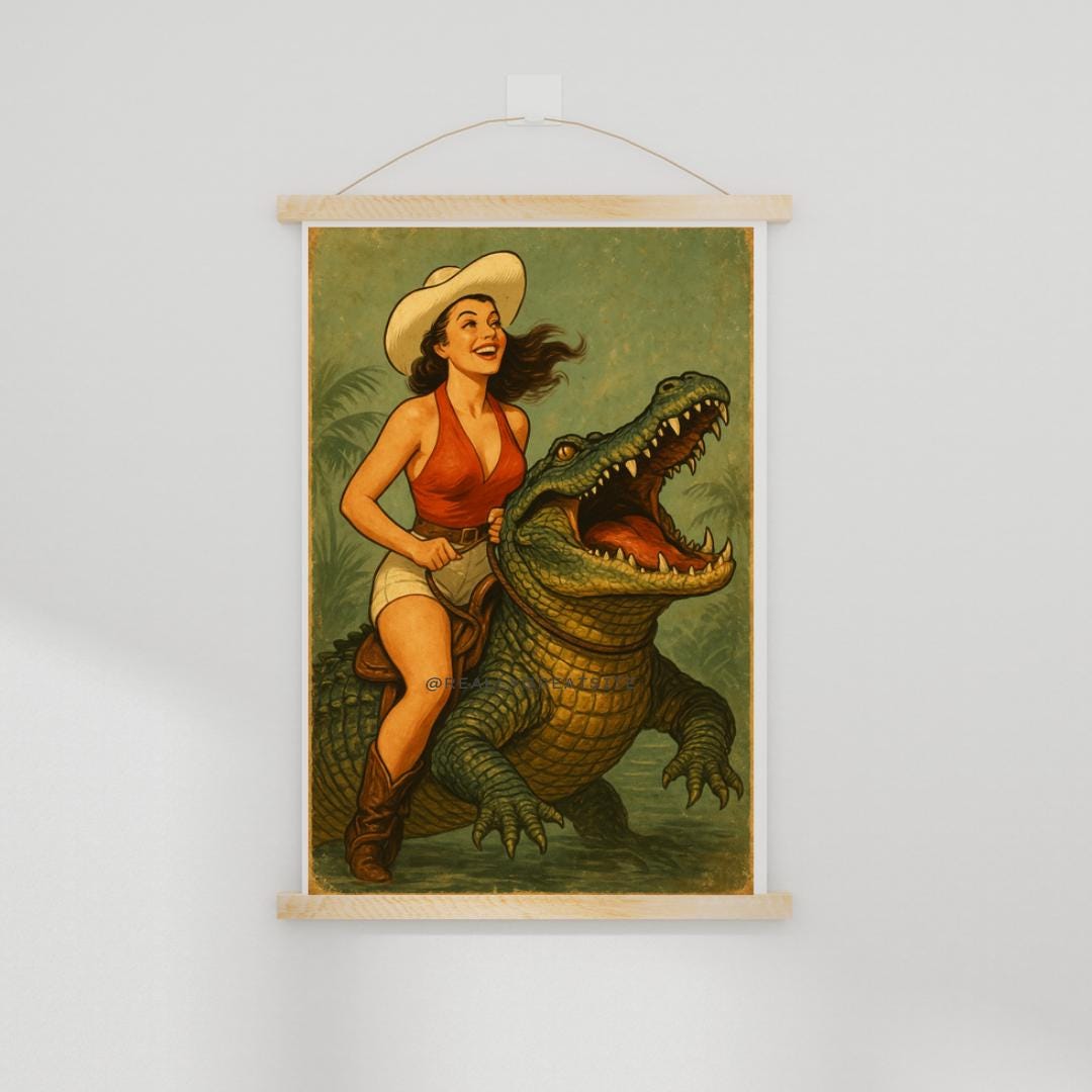 Cowgirl Riding Alligator Digital Print,Cowgirl on Alligator,Southern Rustic Art,Subtle Western Art,Cool It Cowboy Art Prints,unique art gift