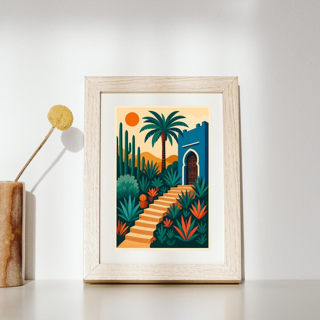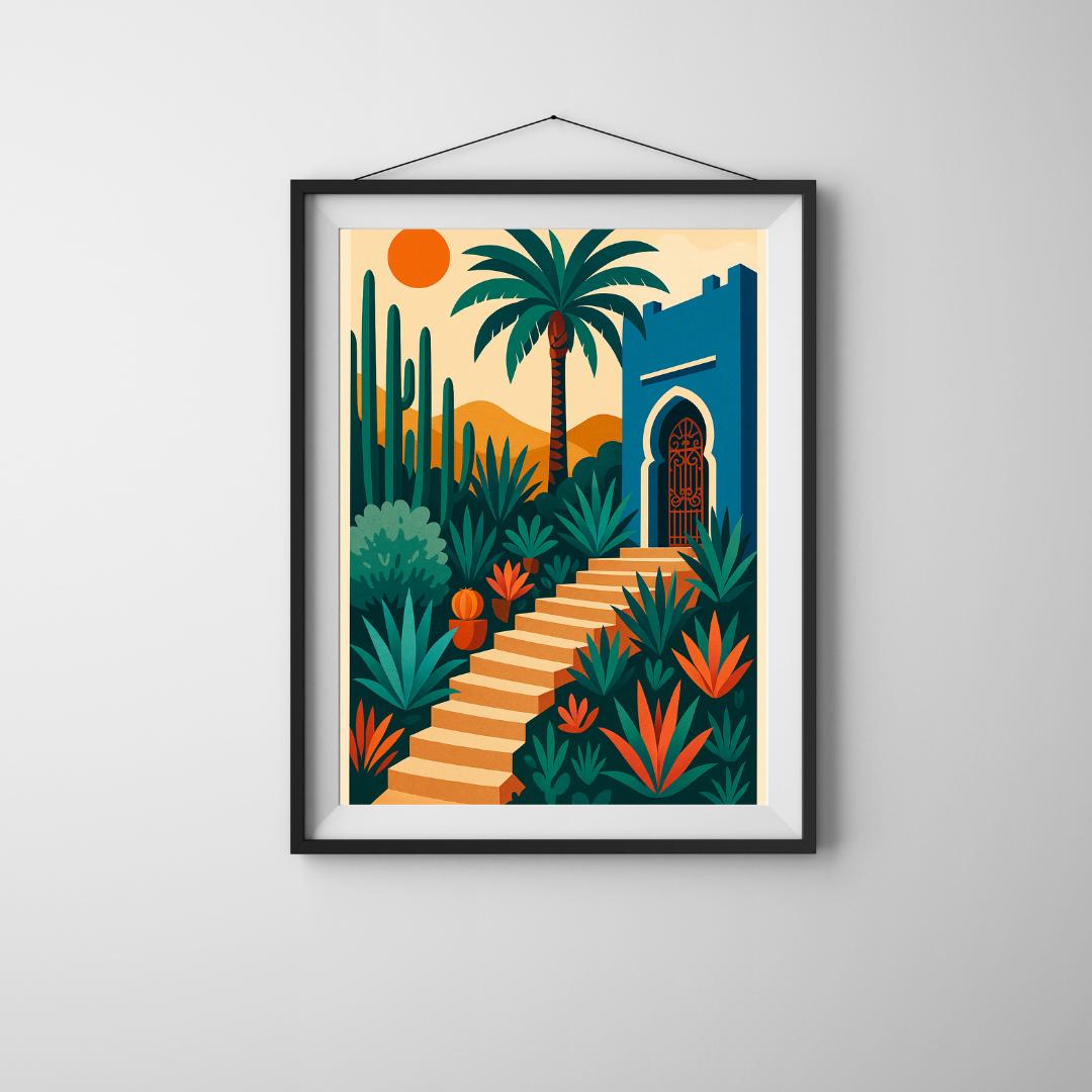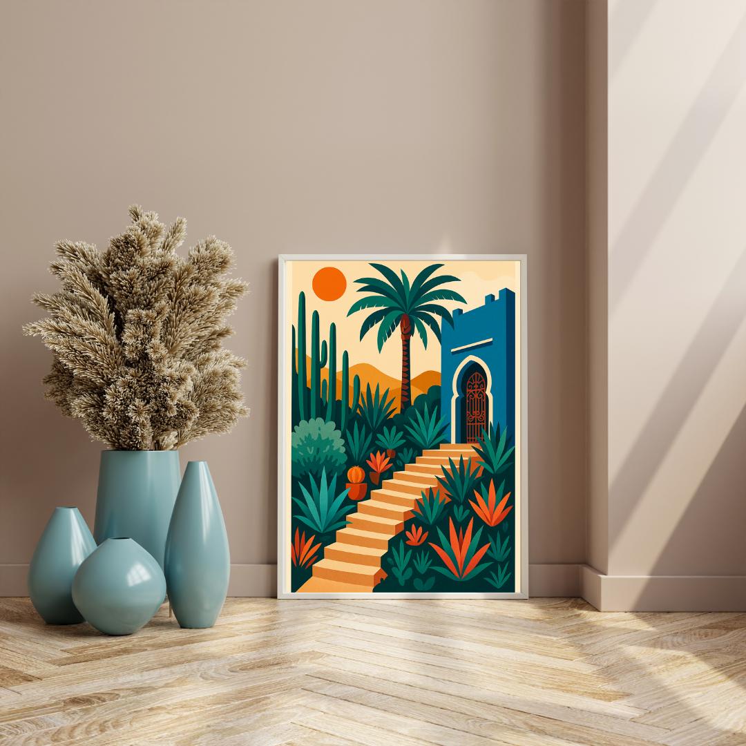 Garden poster,wall art,morocco,marrakesch, vibrant art, maximalist wall art, palm tree,botanical print,blue architecture,art print